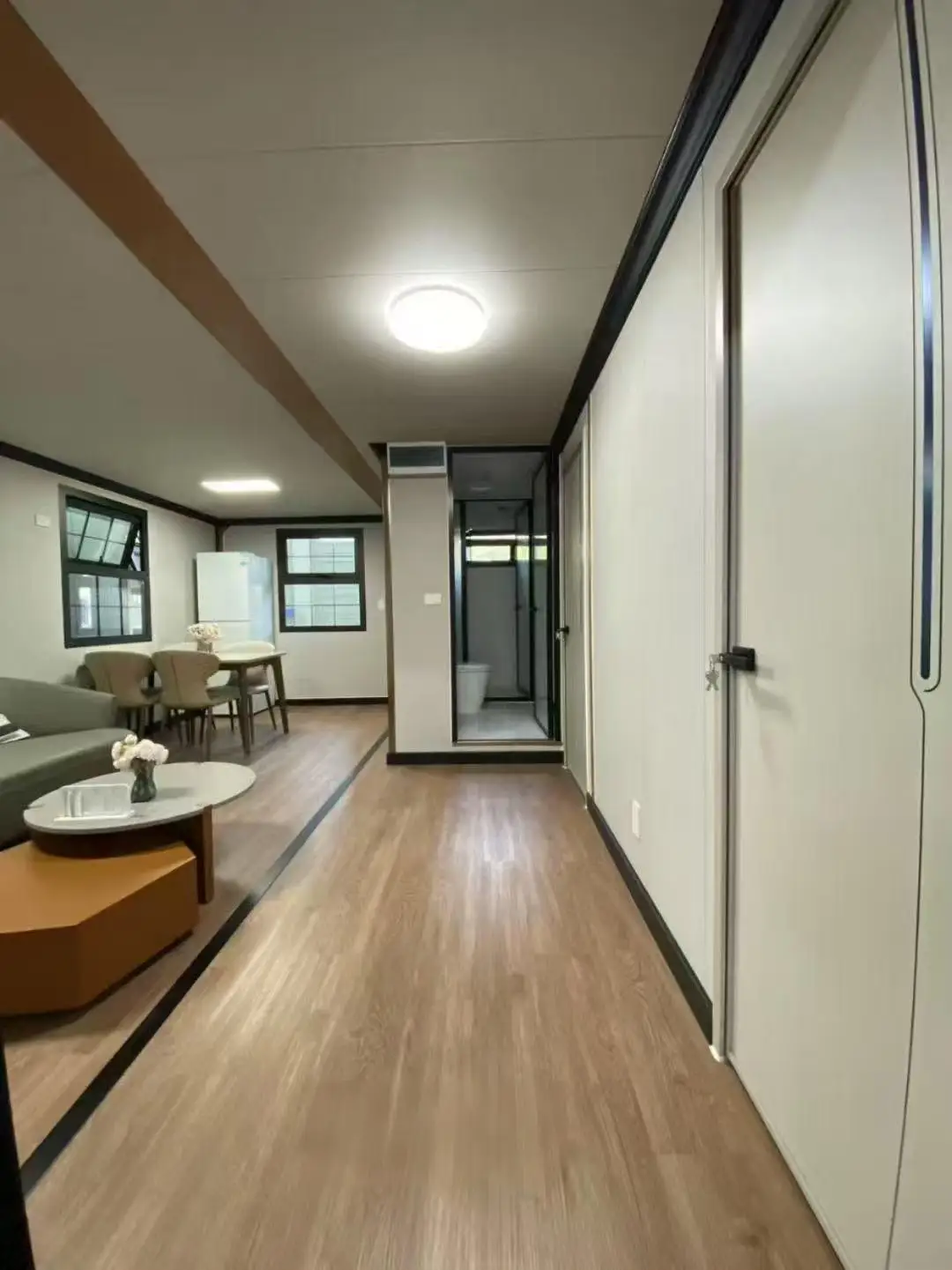 1.This 40-foot modular shipping container house is an expandable and portable urban oasis, which can be easily transported and assembled. It features a wooden interior, making it more comfortable and inviting.